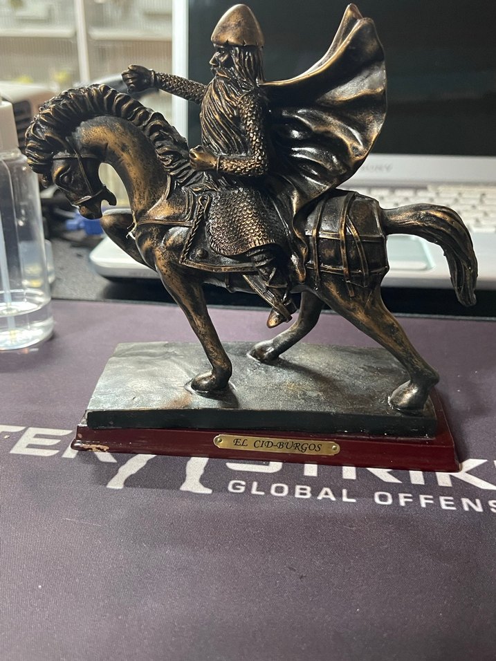 Detaylı zırh ve dalgalanan pelerinli, altın renkli atlı şovalye figürini, 'El Cid-Burgos' etiketiyle .kırık vs yok değerini bilene
