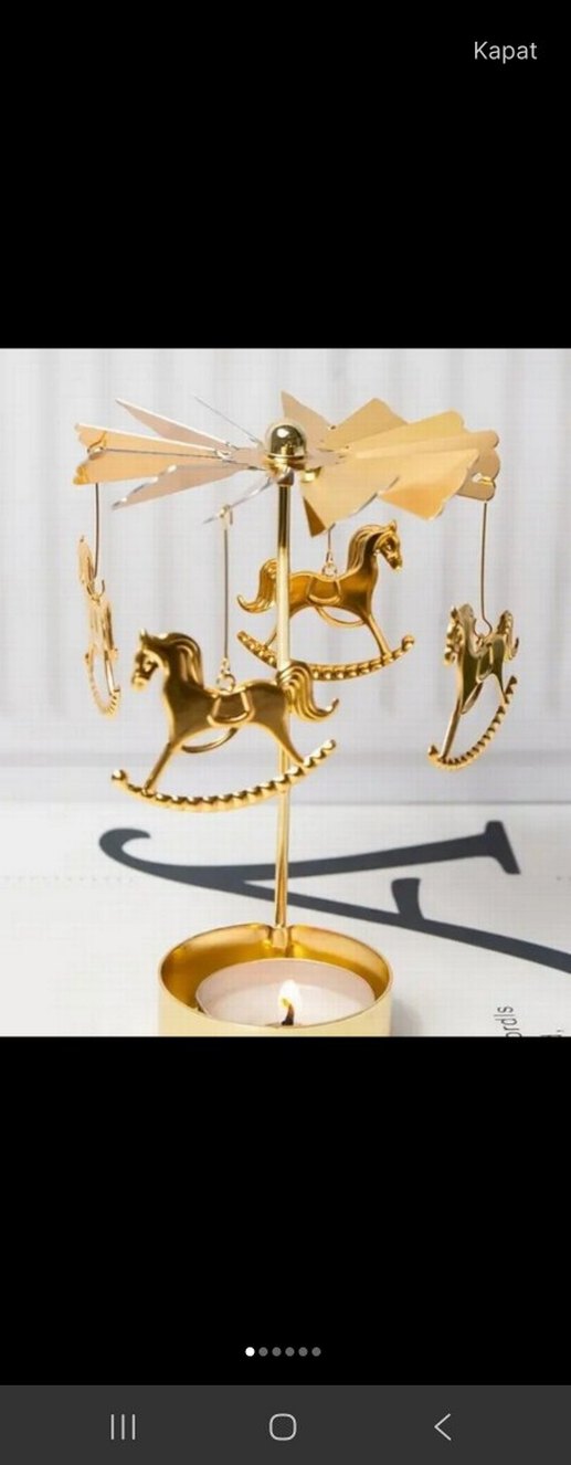 Altın renginde, mum yakıldığında dönen sallanan at figürlü Sıcak ve hareketli bir görsel sunar. MUM HEDİYELİ