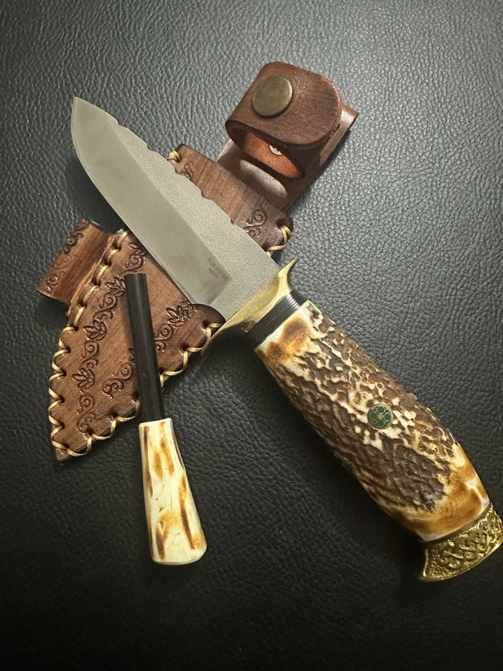 Dokulu saplı altın renkli av bıçağı ve uyumlu saplı küçük taş ateş başlatıcı, süslü deri kılıf ile birlikte.