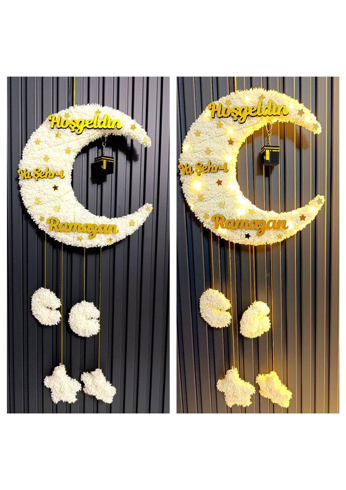 Altın renkli, ışık tonlarında ay ve yıldızlardan oluşan Ramazan süsü. Üzerinde "Hoşgeldin Ramazan" yazısı bulunur. Sıcak bir atmosfer sağlar. sipariş üzerine çalışma yapılacaktır