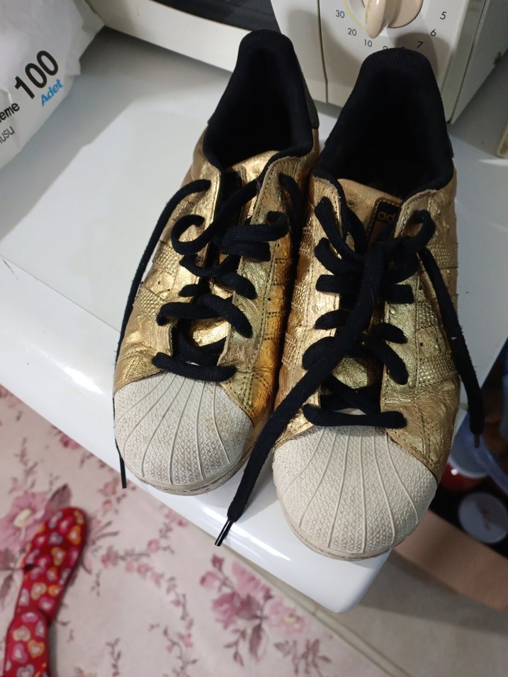 Altın renkli, bağcıklı, düz tabanlı ve parlak görünümlü spor ayakkabılar, sportif ve günlük sokak stili için uygundur.