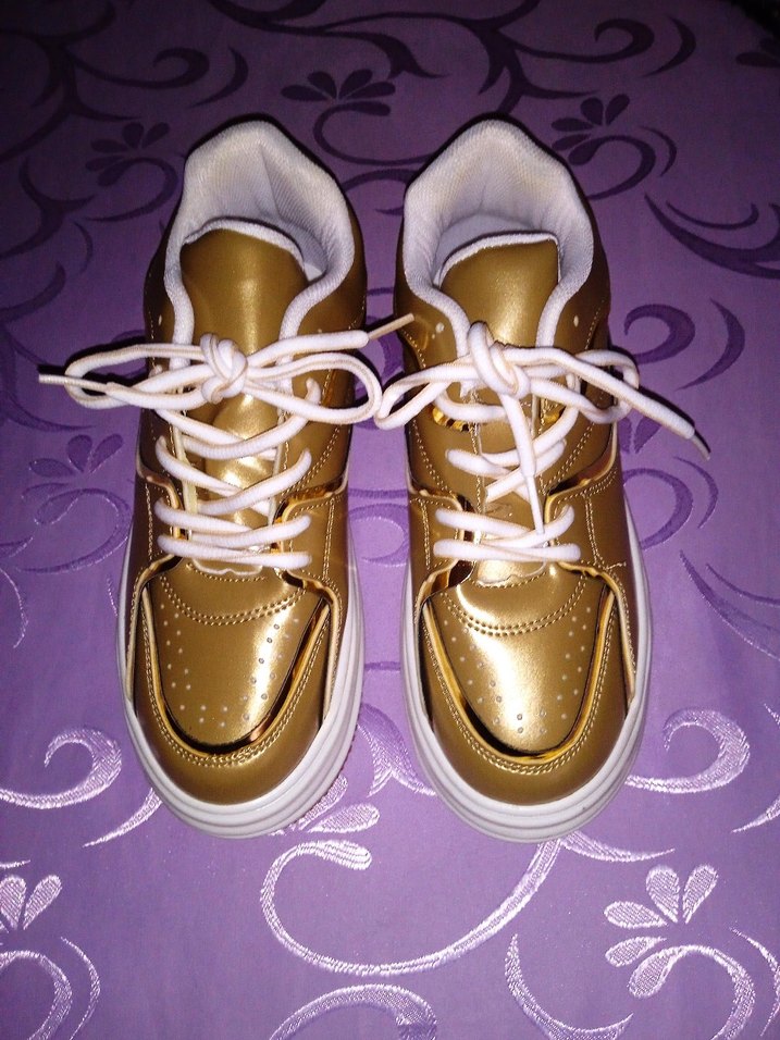 Altın renkli, beyaz bağcıklı, parlak görünümlü, yüksek topuklu ve kauçuk tabanlı kadın spor ayakkabısı.