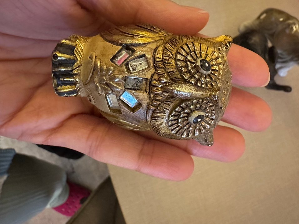 Elinizde tutabileceğiniz, detaylı tüy desenleri ve yansıtıcı dikdörtgen süslemeleri olan altın renkli baykuş figürin.