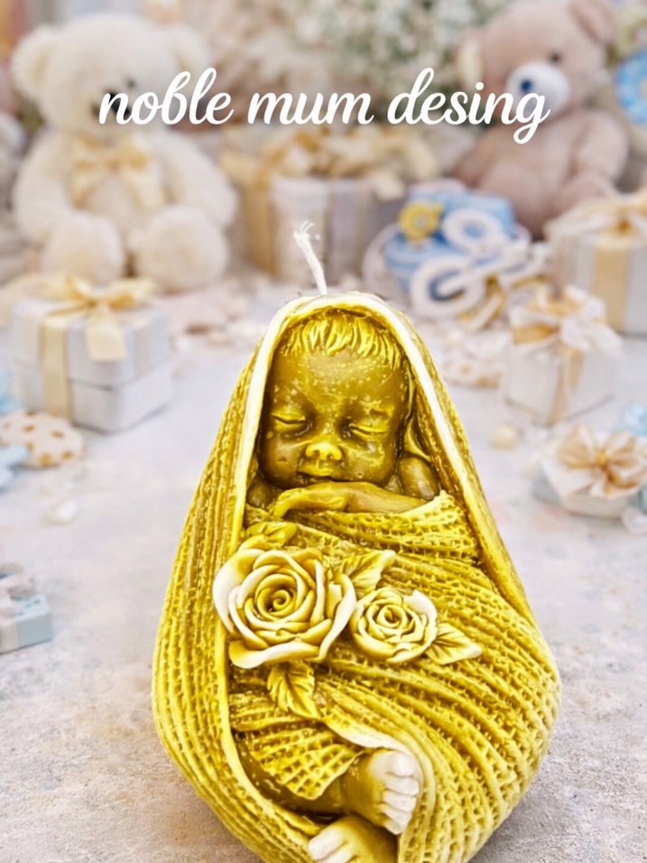 Altın renkli, dokulu örtüye sarılı uyuyan bebek şeklinde mum. Üzerinde 'noble mum desing' yazısı bulunur. ️