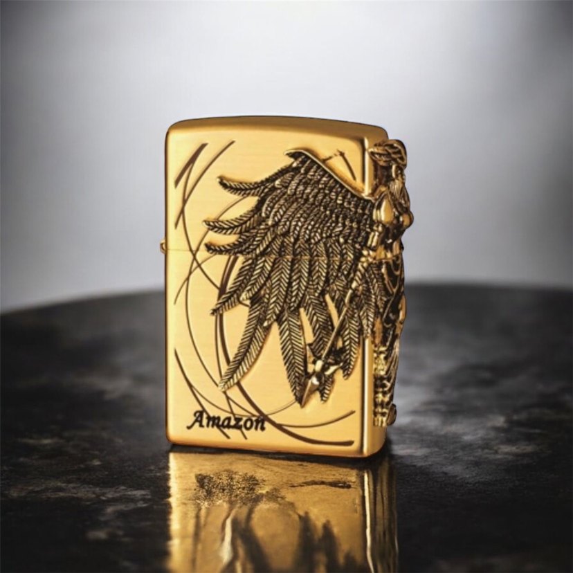 Parlak altın renkte, kanatlı figür detaylı, bohem ve retro tarzda erkek rozeti. Üzerinde "Amazon" yazısı bulunur. ️