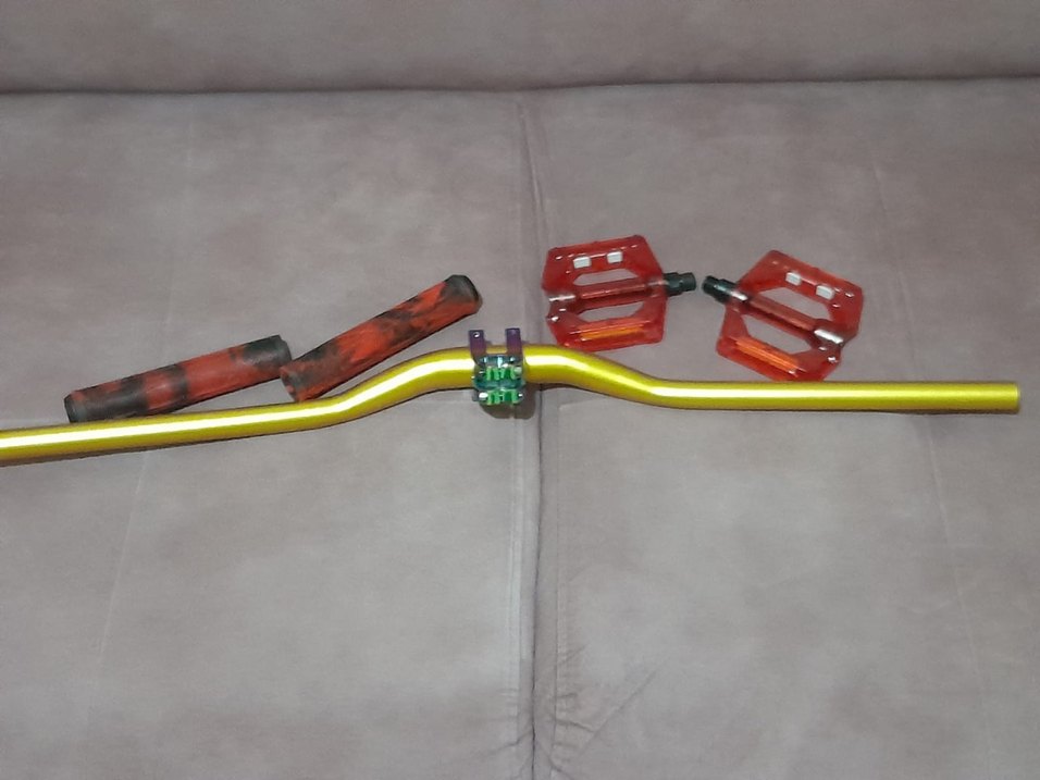 Altın renkli gidon ve kırmızı pedallardan oluşan renkli bisiklet seti, bisikletinize canlı bir görünüm kazandırır. sıfır hiç kullanılmadı