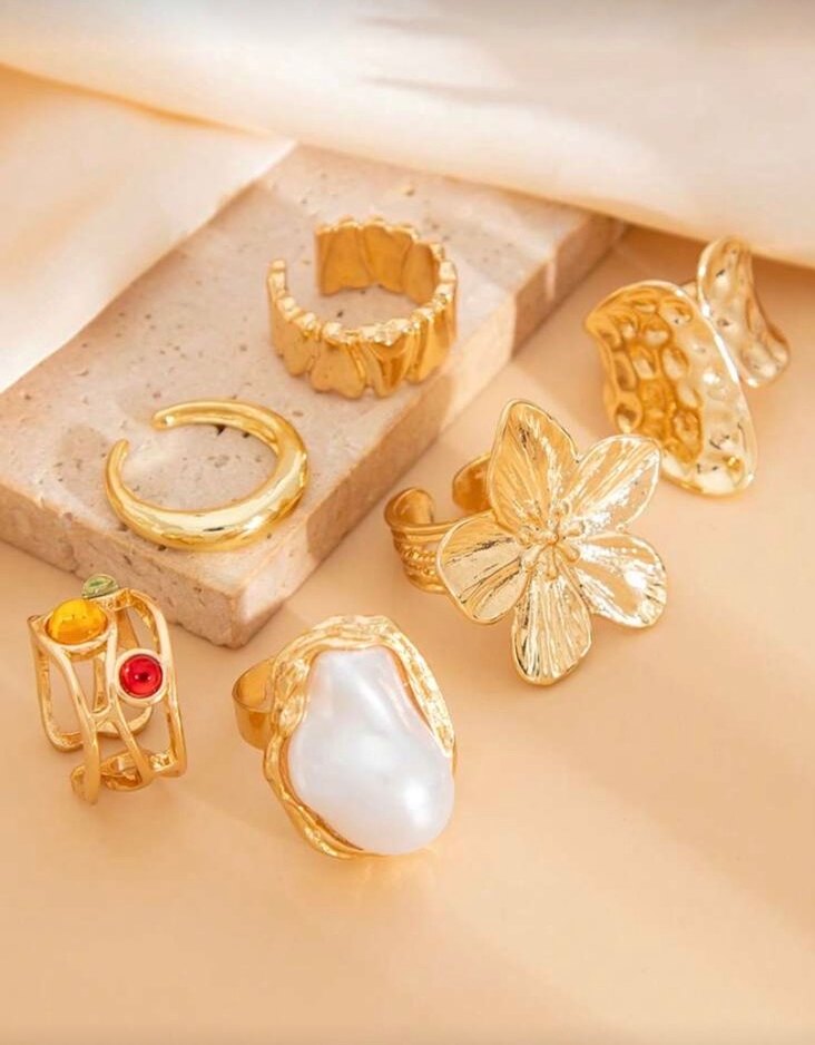 Altın renkli, çiçek ve boncuk detaylı bohem tarzda kadın yüzük seti. Minimalist ve retro dokunuşlarla düğün için uygun tasarım.