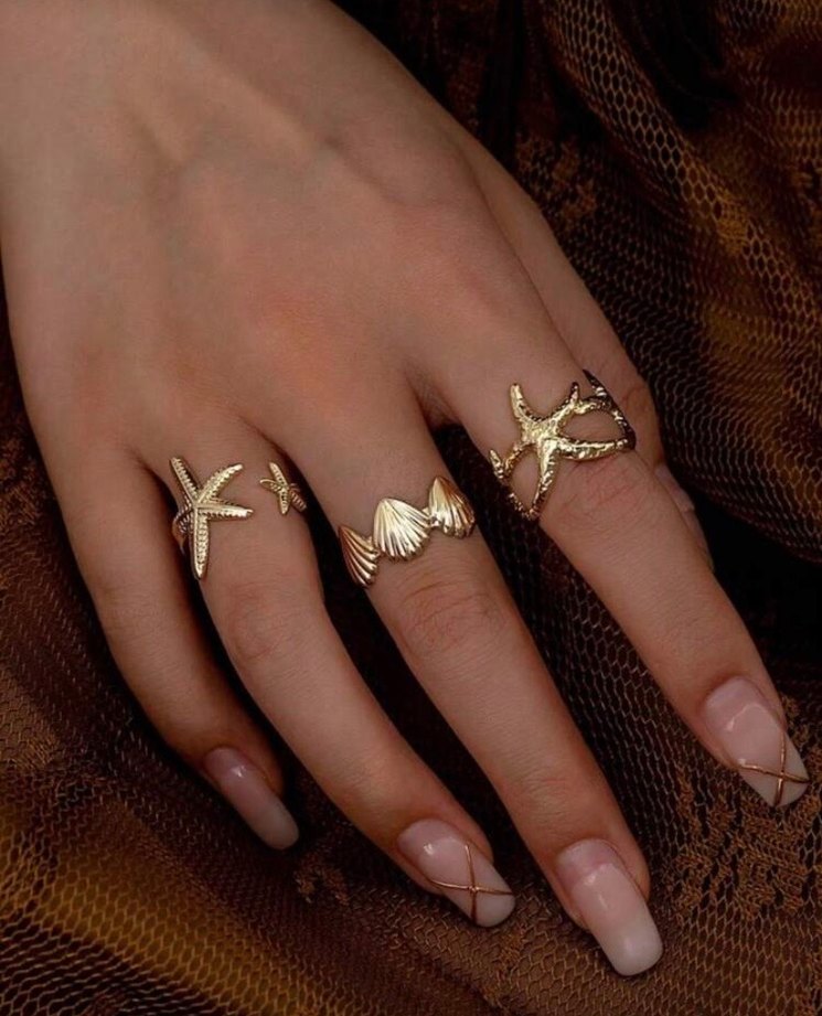 Parlak altın renkli, deniz kabuğu ve denizyıldızı detaylı bohem yüzük seti, günlük kullanım için uygun . Set fiyatıdır