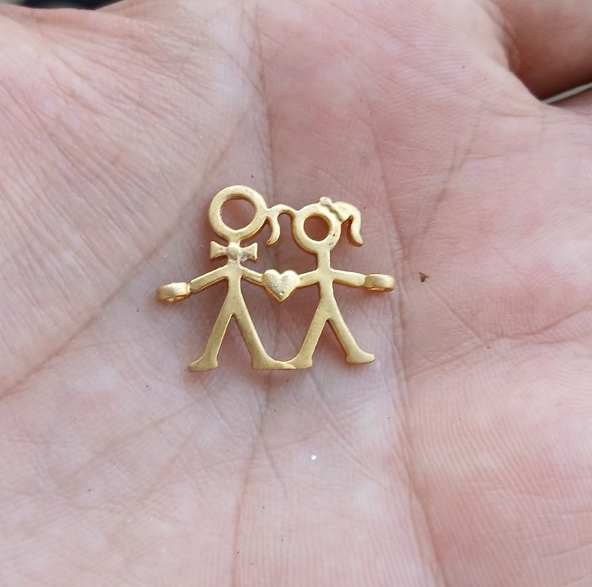 Altın renginde, bohem tarzda iki kadın figürünün kalp tutan minimal ve renkli baskılı charm'ı. Düğün için uygun, tokalı tasarım içerir.