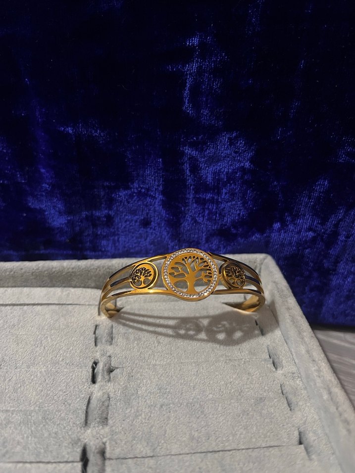 Parlak altın renkli, kemerli ve ağaç desenli bohem tarzda kadın bileklik, klasik zarafet için düğünlerde tercih edilir.