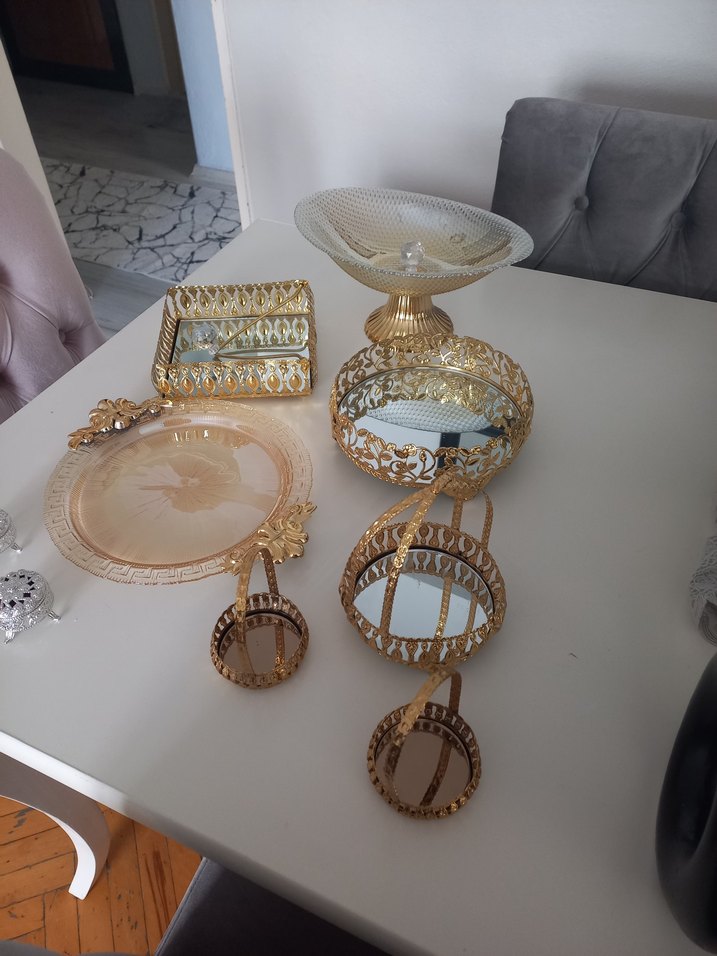 Hafif altın tonlarda, nakışlı desenlere ve yansıtıcı yüzeylere sahip bohem tarzı sofra seti, tabaklar ve dekoratif tutucular içerir. ✨