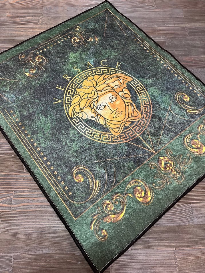 Koyu renkli halı, altın Medusa motifi ve detaylı bohem desenlerle dikkat çekiyor, mekâna şık bir hava katıyor.