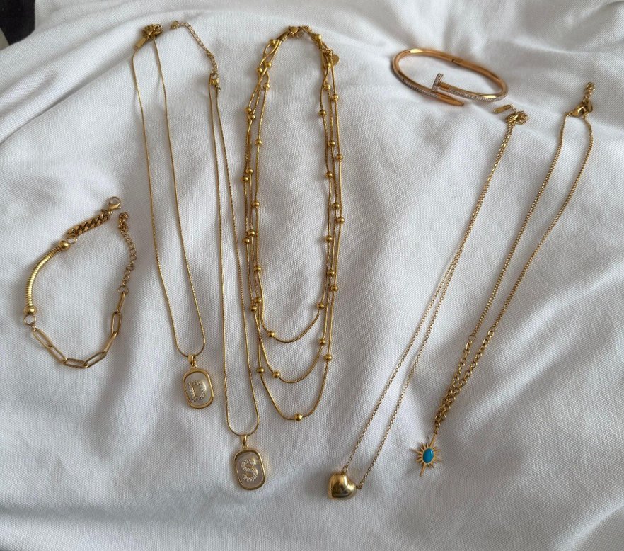 Altın renkli, zincir detaylı midi uzunlukta bohem tarzda kadın kolyeleri. Kalp ve turkuaz taşlı kolye uçları bulunur, günlük kullanım için uygundur. ✨