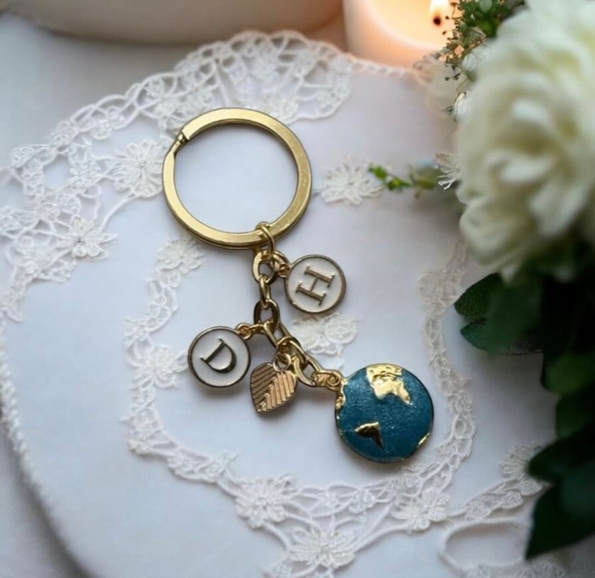 Altın renkli zincir detaylı, renkli dünya figürlü ve harfli bohem tarzda kadın anahtarlık.
