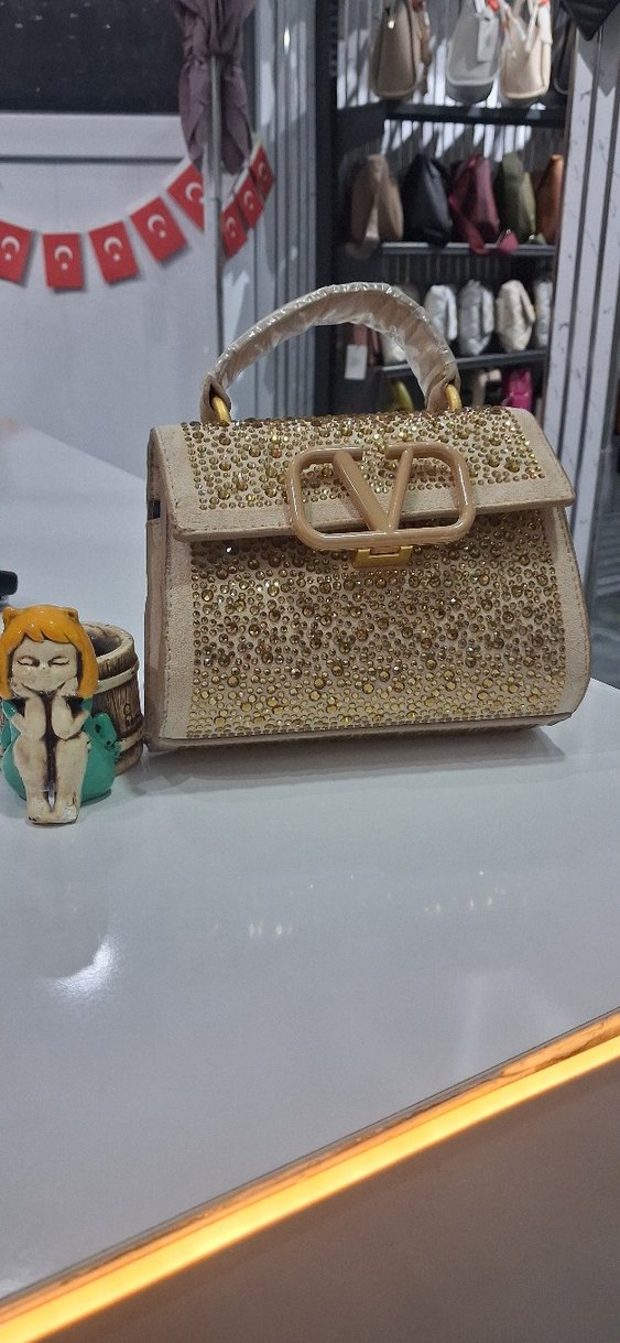 Altın Renkli Boncuk İşlemeli Deri Kadın Çantası