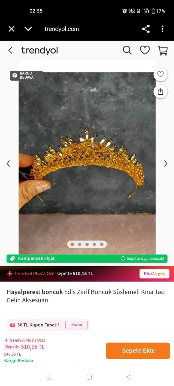 Altın renkli, zarif boncuk işlemeli kına tacı. Parlak ve gösterişli tasarımı ile klasik şıklığı yansıtır. ✨