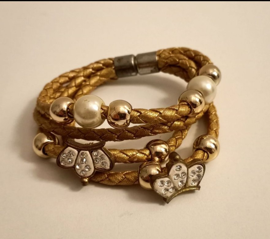 Parlak altın renkli örgülü kayışlara sahip bohem tarzda, boncuklu ve kristal süslemeli taç figürlü bileklik. Günlük kullanıma uygun. ✨