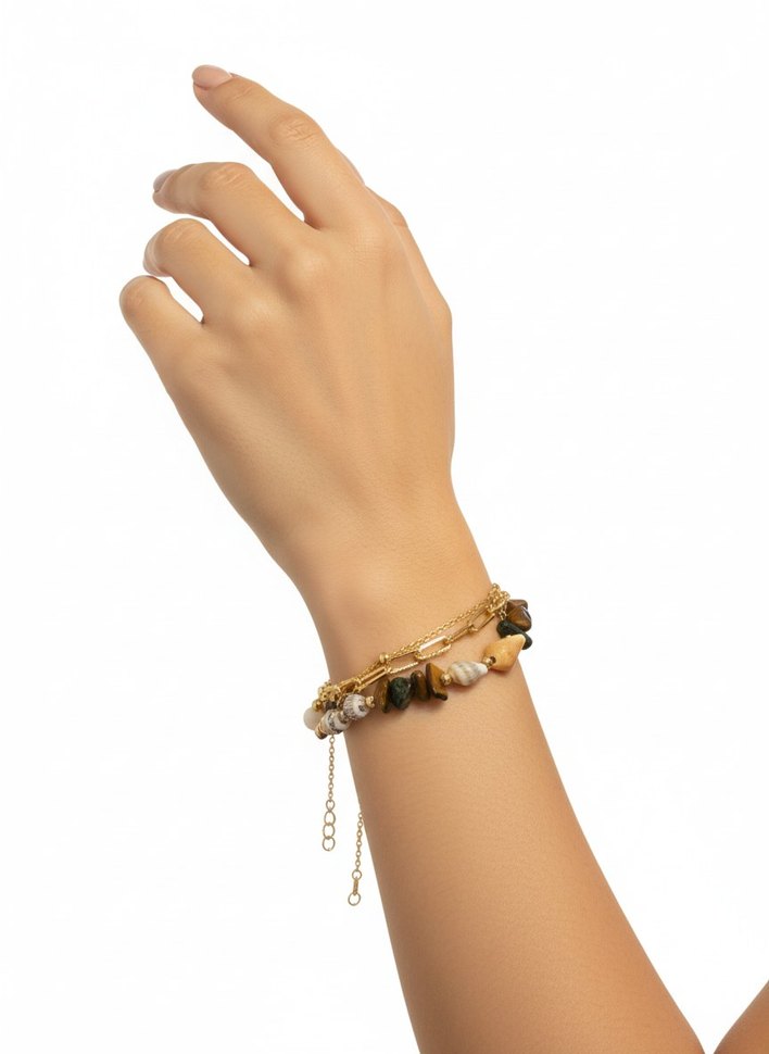 Altın renkli, boncuk detaylı ve hafif yılan deseni olan minimalist bohem tarzda kadın bileklik. Günlük kullanıma uygun. ✨