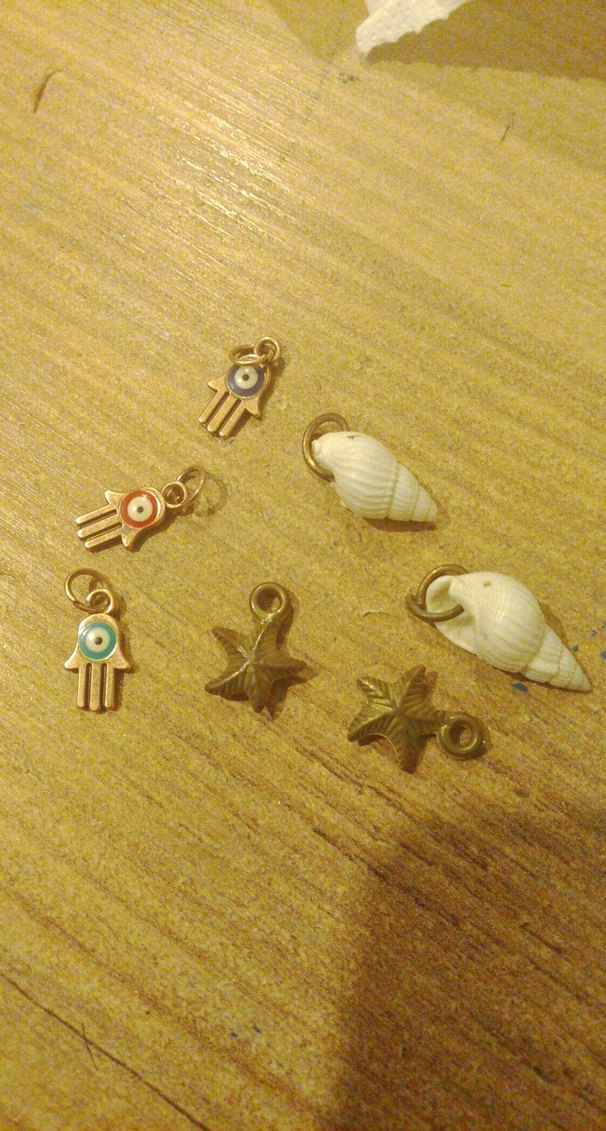 Altın renkli, boncuklu detaylara sahip bohem ve plaj temalı kadın charmları, deniz kabuğu ve yıldız figürlü.