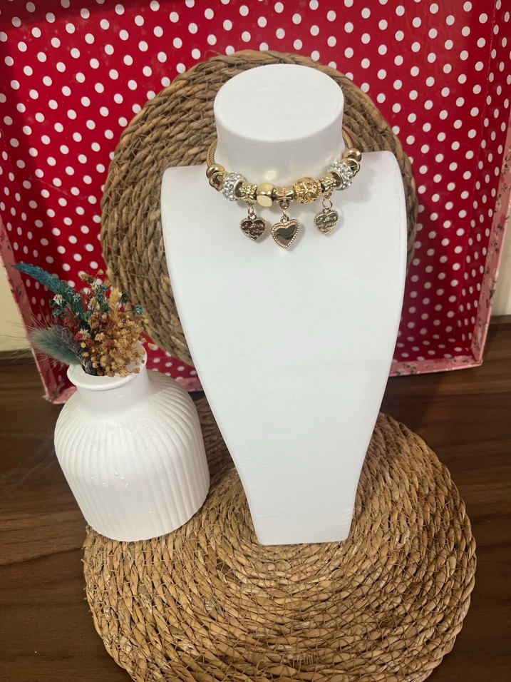 Hafif altın renkli boncuklardan oluşan, nakış desenli ve kalp figürlü charm detaylı bohem tarz bileklik.