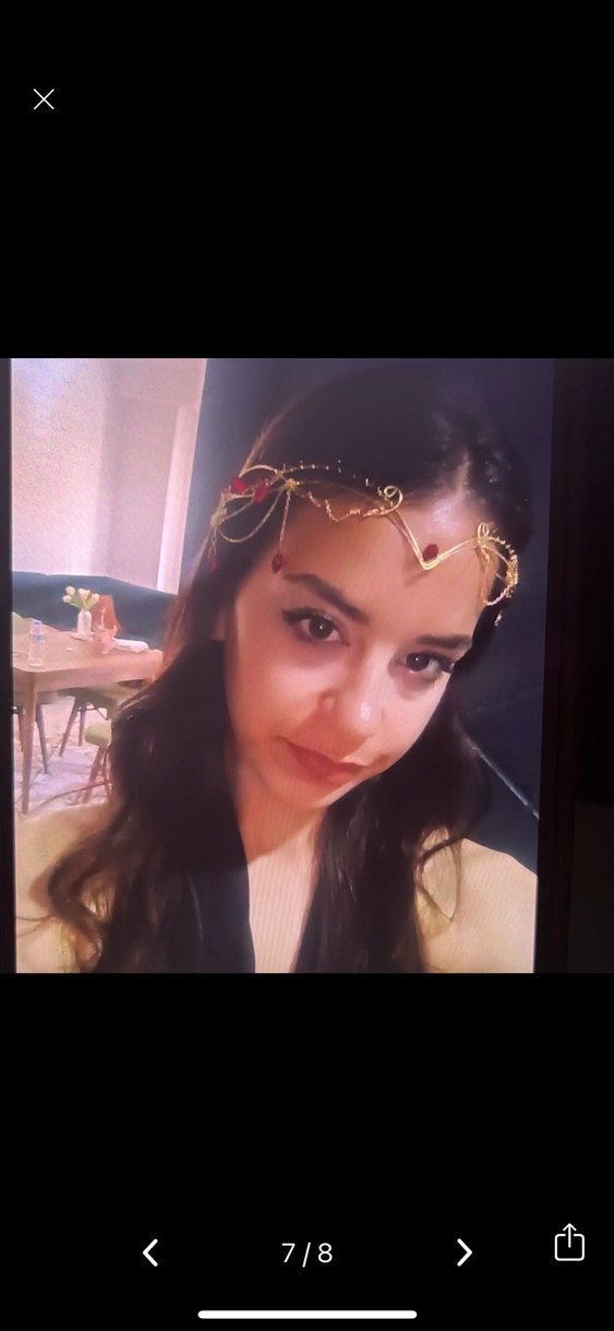 Parlak altın renkli, cam boncuklarla süslenmiş bohem tarzda saç aksesuarı. ✨
