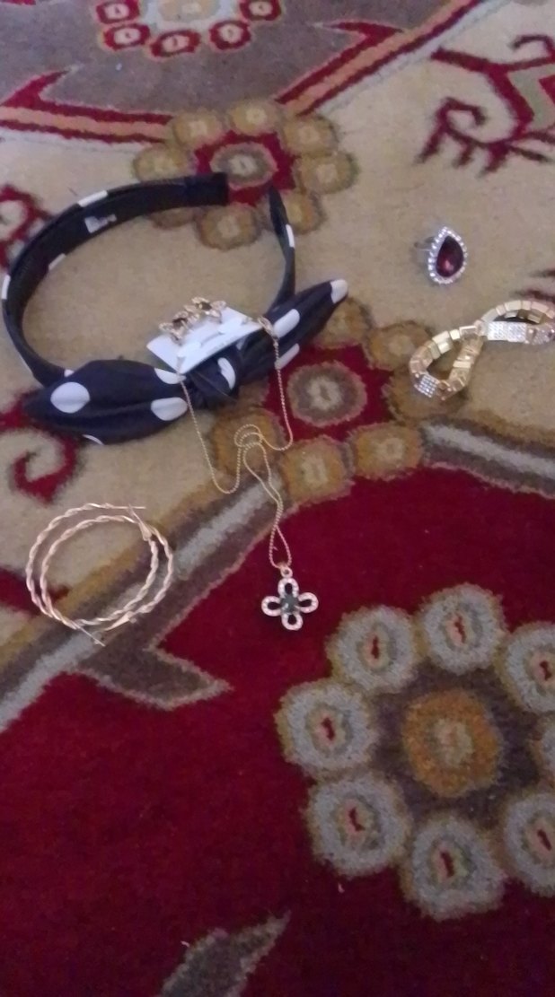 Çiçek motifli boncuklu kolye, halka küpeler, koyu taşlı yüzük ve beyaz benekli siyah saç bandından oluşan altın renkli bohem takı seti.