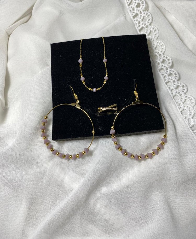 Altın renkli boncuklu kolye, halka küpeler ve yüzükten oluşan minimalist bohem takı seti, günlük kullanım için uygundur.