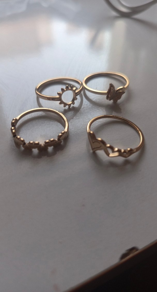 9 ayar Altın renkli, boncuklu ve minimal bohem tasarımlı yüzük seti. Gündelik kullanım için uygun, güneş, kelebek ve geometrik figürler içerir. ✨