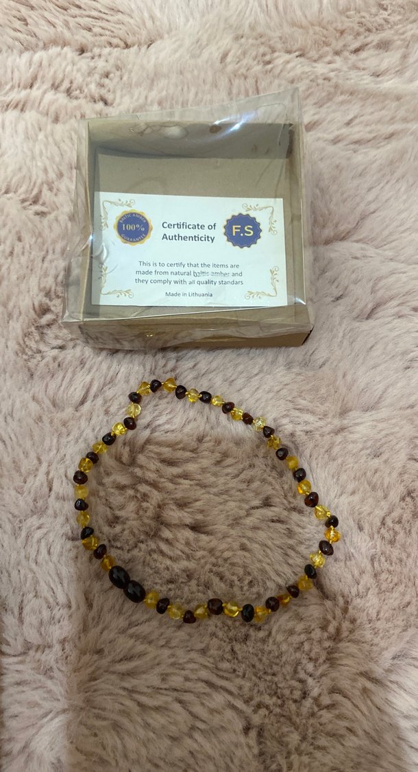 Bohem tarzda, baskılı desenli, koyu altın renkli boncuklu çocuk kolyesi. Sertifika ile birlikte gelir.