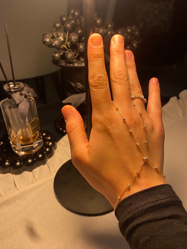 Altın renkli, boncuklu ve parlak görünümlü el zinciri, minimalist ve bohem tarzıyla günlük kullanıma uygundur.