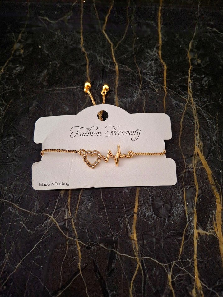 Parlak altın renkli, kalp ve nabız figürlü boncuklu bileklik. Minimalist ve bohem tarzda, şık ve gündelik kullanıma uygun. Türkiye'de üretilmiştir.