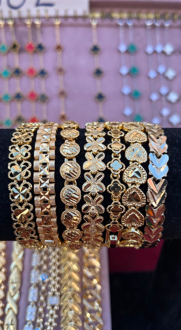 Altın renkli boncuklu ve desenli bileklikler, bohem ve gösterişli tarzı yansıtır. Düğünler için uygundur. ✨ adet fiyatıdır kararma solma yapmaz kuyumcu işçiliği