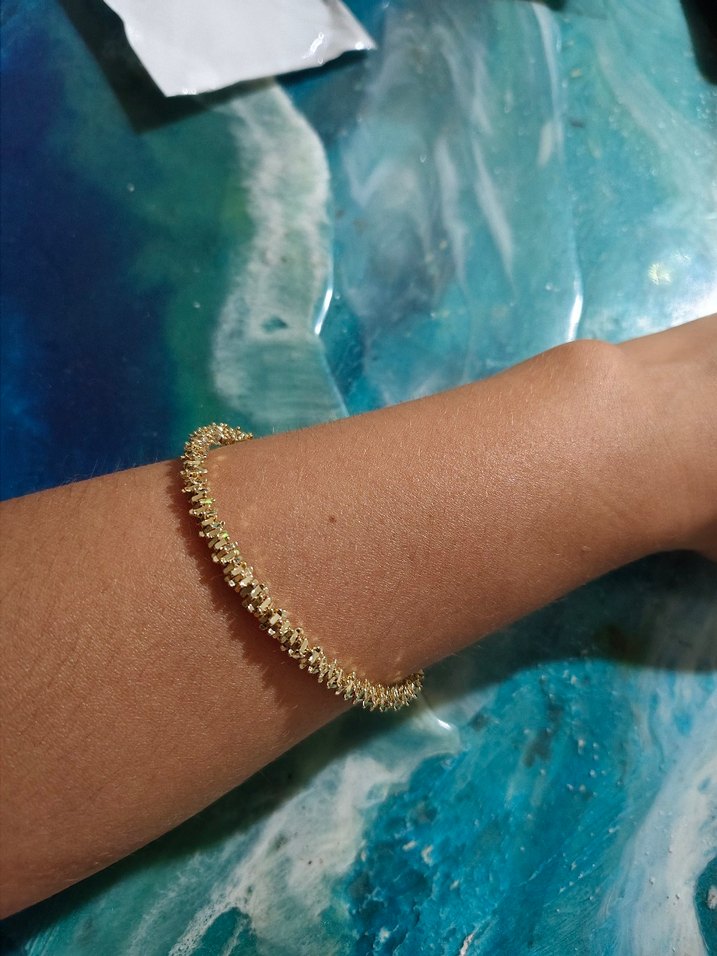 Altın renginde, küçük boncuklarla süslenmiş, minimalist ve bohem tarzda günlük kullanıma uygun çelik bileklik. ✨