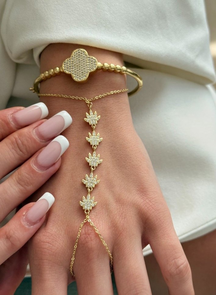 Altın renkli, boncuklu ve çiçek desenli kadın el zinciri. Minimalist bohem tarzda, düğün ve retro görünümler için uygundur. ✨