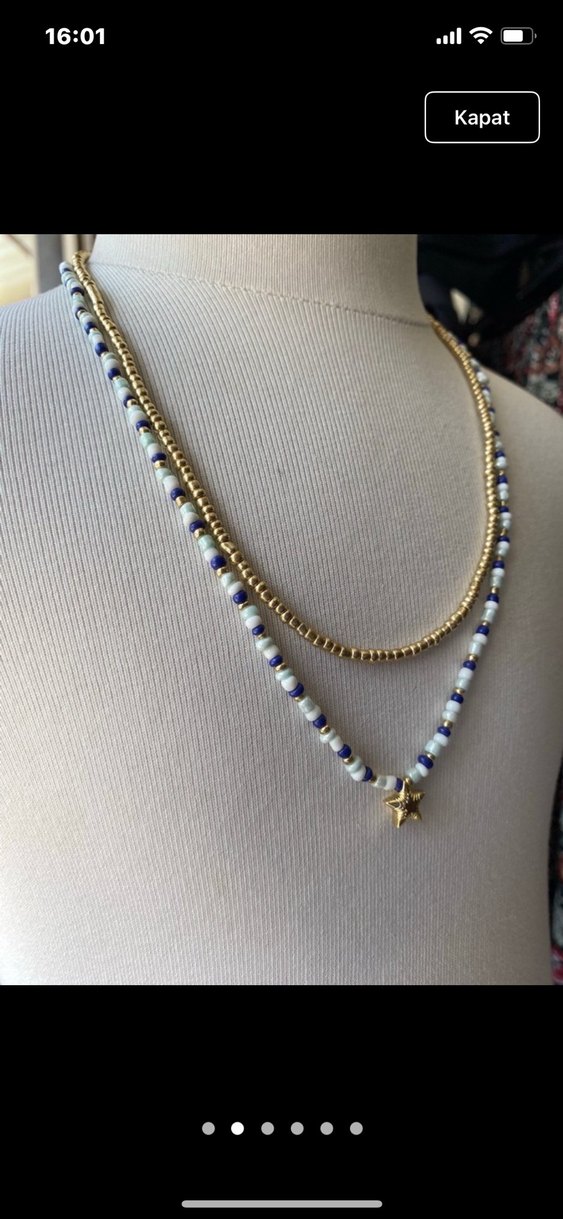 Altın renkli zincir ve beyaz-mavi boncuklu mini kolye, küçük yıldız figürüyle tamamlanmıştır. Günlük kullanıma uygundur. ✨ el emeği