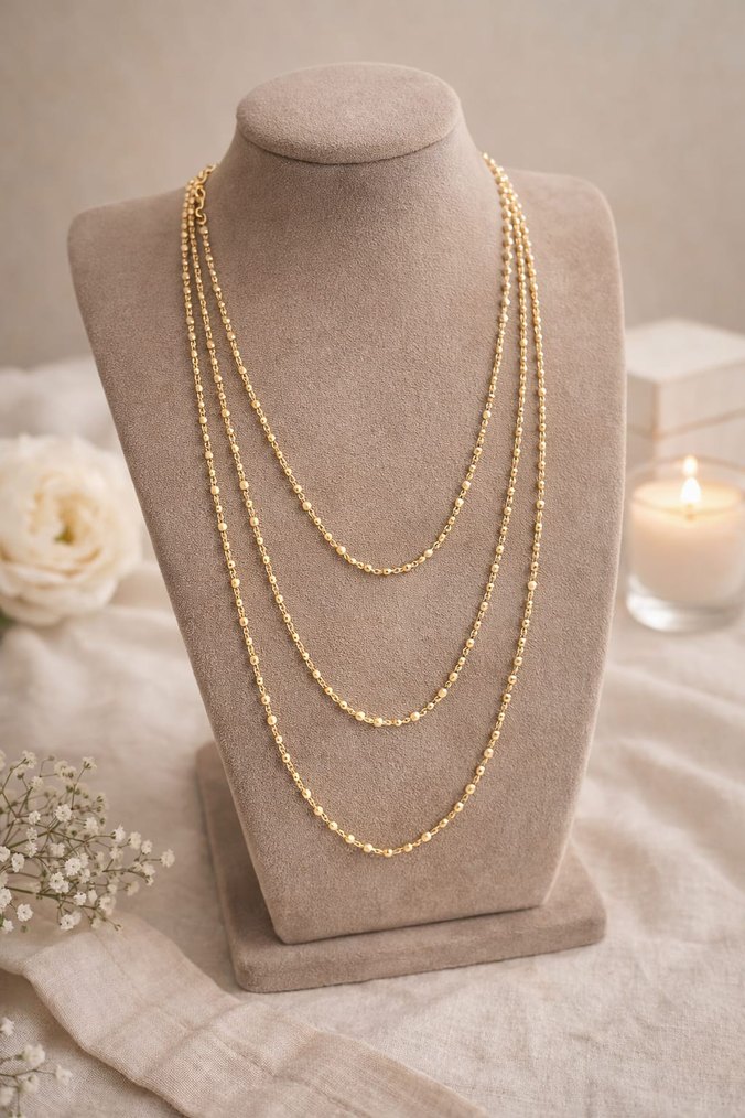 Parlak altın renkli boncuklardan oluşan midi uzunlukta, minimalist ve bohem tarzda günlük kullanıma uygun kolye. ✨