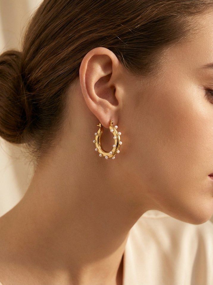Altın renkli, boncuk detaylı midi küpe. Hafif puantiye deseniyle klasik ve çağdaş düğün stillerine uyum sağlar. ✨
