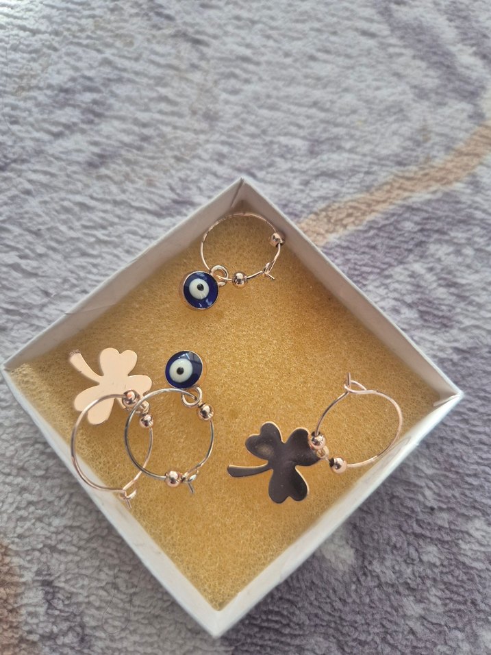 Altın renkli mini halka küpeler, boncuklu detaylar ve defne yaprağı retro tarzı yansıtıyor. Günlük kullanıma uygundur.