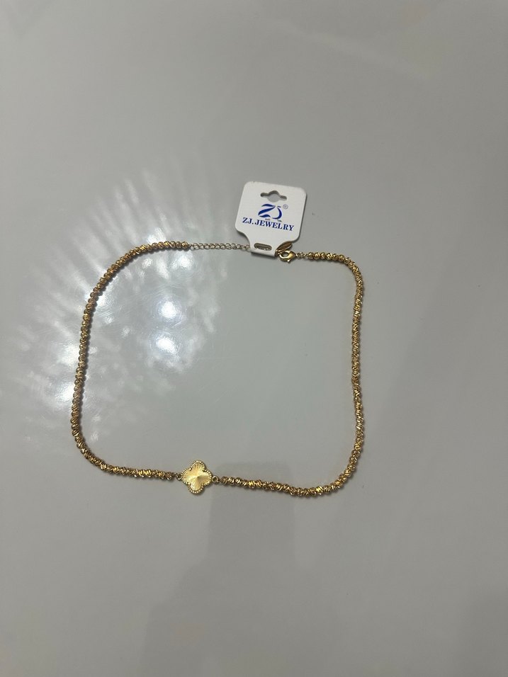 Kısa uzunlukta, parlak altın boncuklardan oluşan ve küçük yonca kolyeli günlük minimalist ve bohem tarzlara uygun kolye.