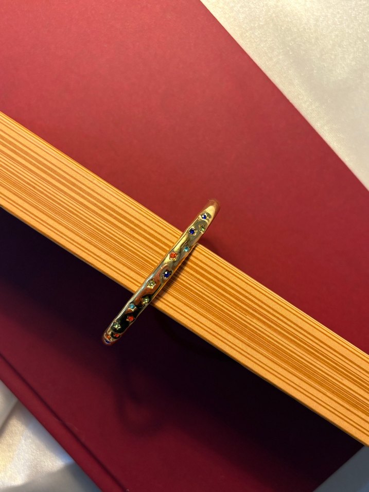 Parlak altın renkli, boncuklu yılan desenli bileklik, romantik akşamlar için mütevazı bohem tarzını yansıtıyor.