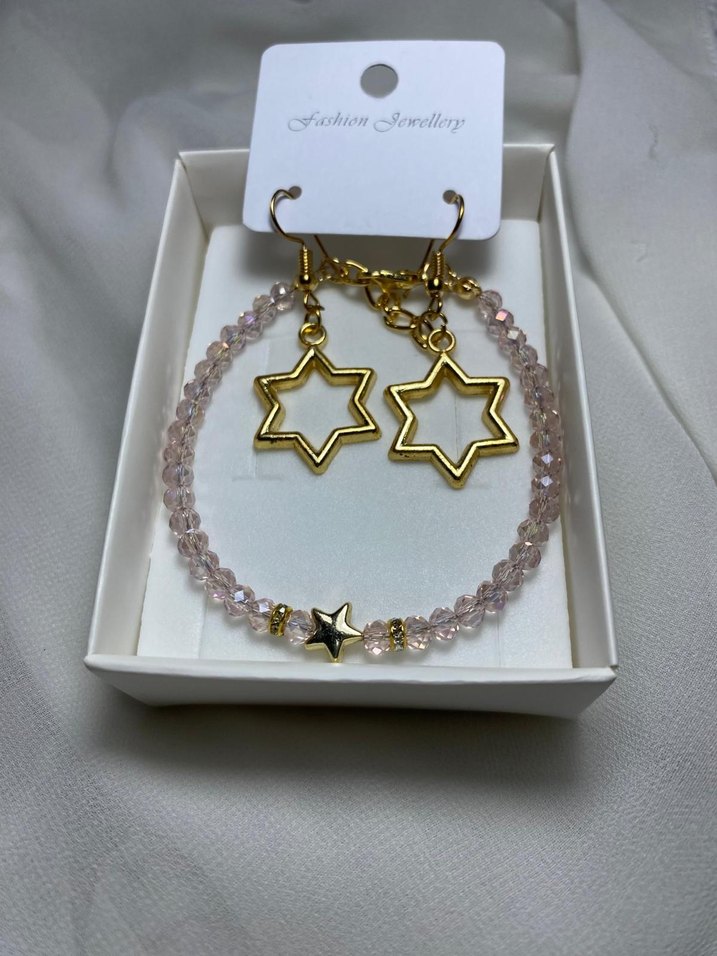 Altın renkli boncuklardan oluşan bileklik ve yıldız şeklinde küpeler içeren, minimal ve bohem tarzda günlük kullanım için set. ✨