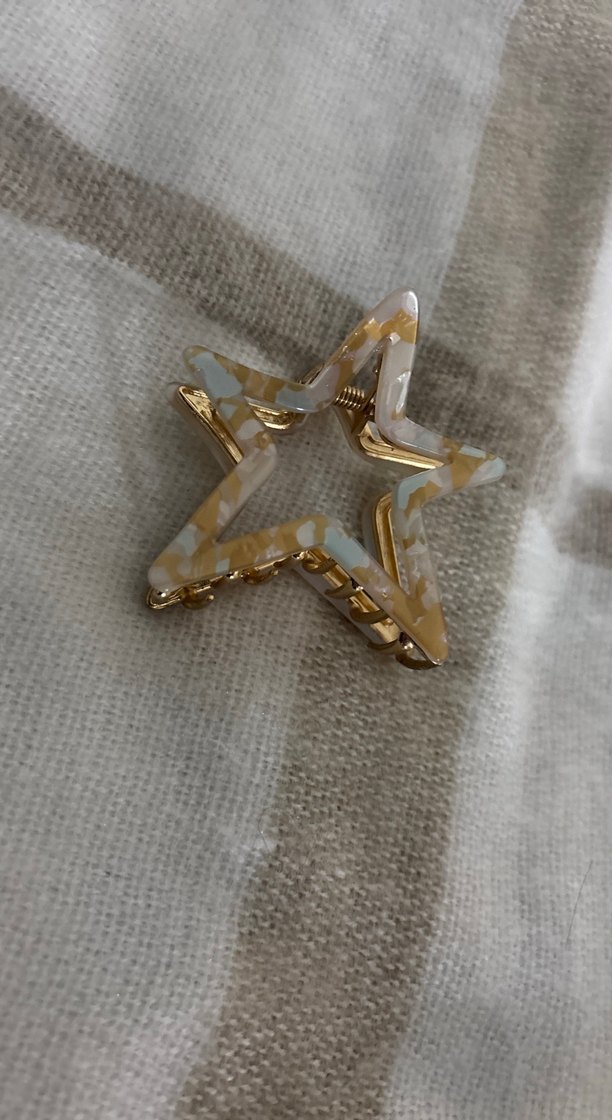 Pastel altın boncuklarla süslenmiş yıldız şeklinde plastik saç tokası. Bohem ve retro tarzlar için uygun.