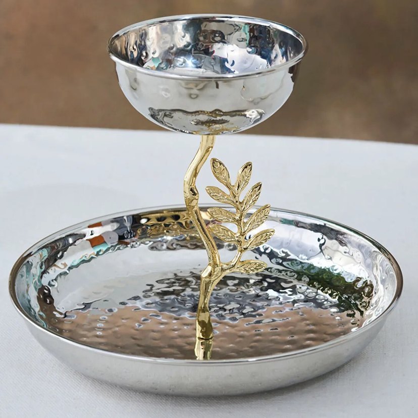 Parlak altın renkli yaprak detaylı ayak ve dövme desenli gümüş tabanlı çağdaş tabak. ️
