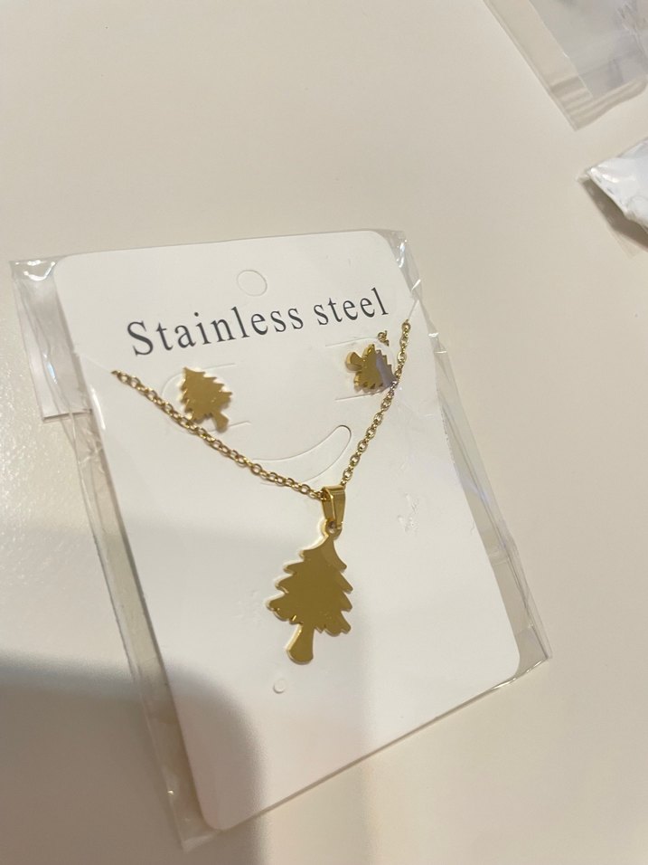 Paslanmaz çelikten yapılmış, kısa altın renkli zincirli ve ağaç figürlü kolye küpe seti Günlük sokak modasına uygun.