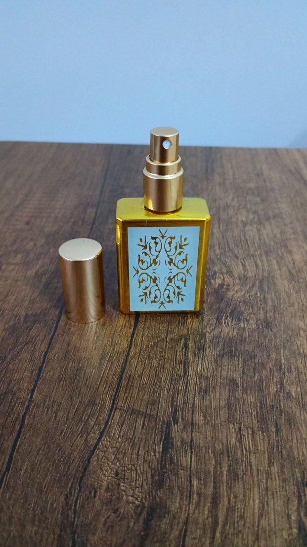 Altın renkli, üzeri çiçek desenli dikdörtgen kadın parfüm şişesi. Sprey başlığı ve uyumlu kapak bulunur.