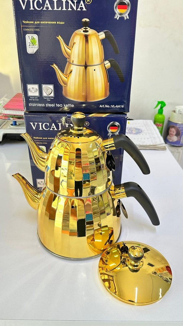 Altın renkli, siyah saplı ve parlak yüzeyli paslanmaz çelik çaydanlık setidir. "VICAI" markalıdır. paslanmaz çelik