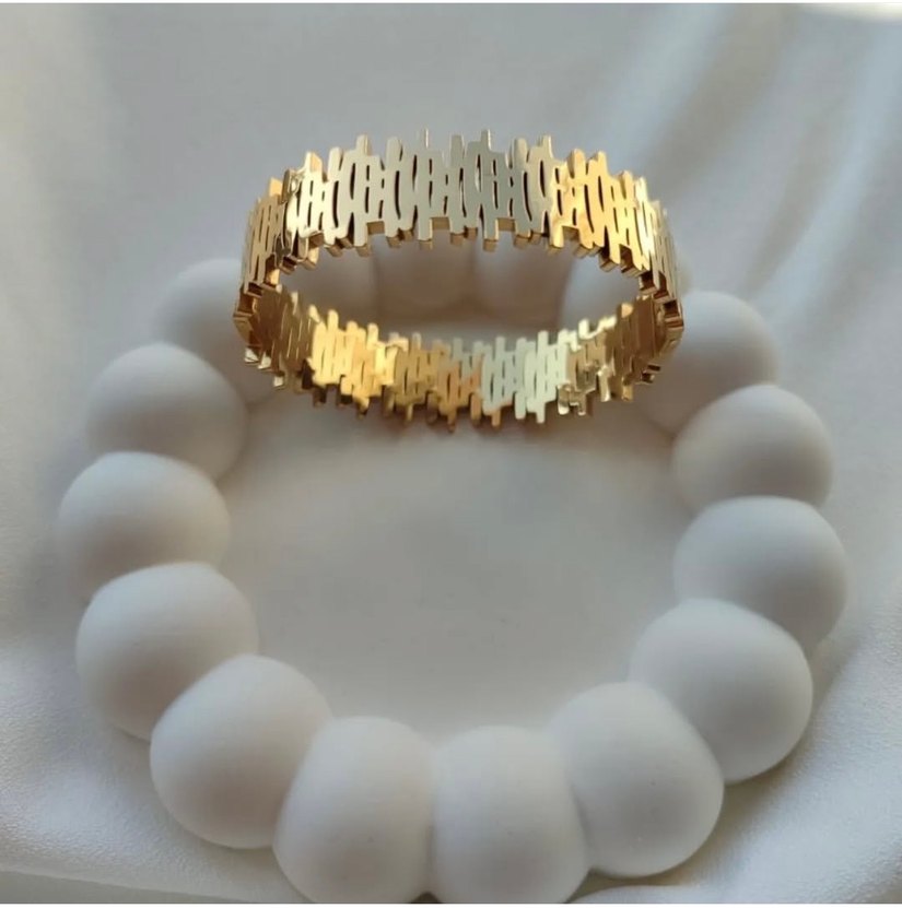 Zarif yapısıyla modern ve avangart tasarıma sahip altın renkli kadın bileklik, düğünler için uygun.