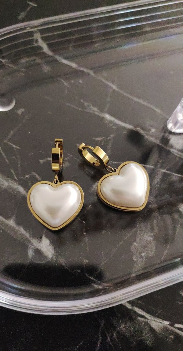 Parlak altın renkte, kısa uzunlukta, modern klasik tarzda kalp şeklinde parlak küpeler.