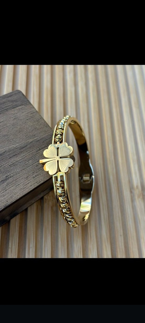Parlak altın renkli, kelepçeli ve sade yonca detayı olan minimal bohem stil bileklik.