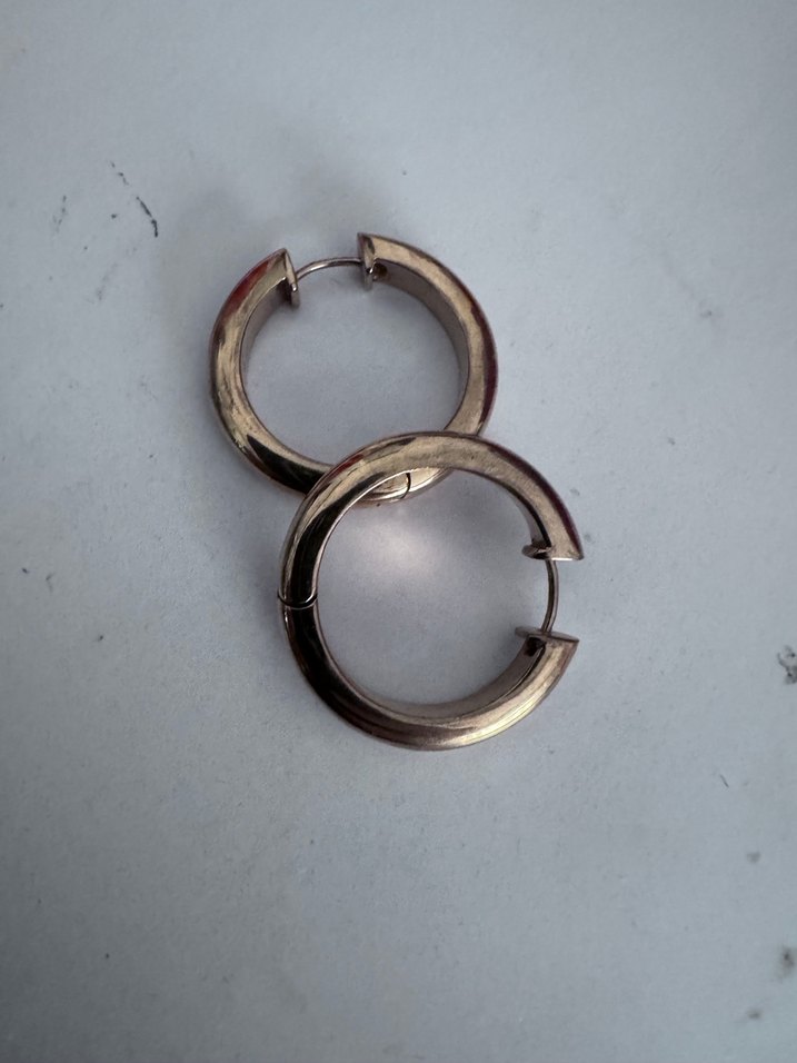 Altın renkli, parlak yüzeyli. Bana ağır geldi küpeler. Az kullanıldı. günlük kullanım için uygun. Çok az rengi solmuş küpenin iğne kısmında